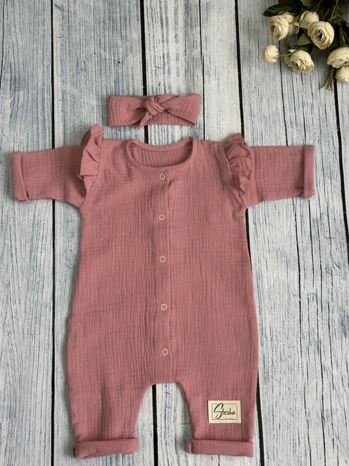 Комбинезон  с повязкой из муслина для девочки. Очень красивое и мягкое, в живую еще лучше