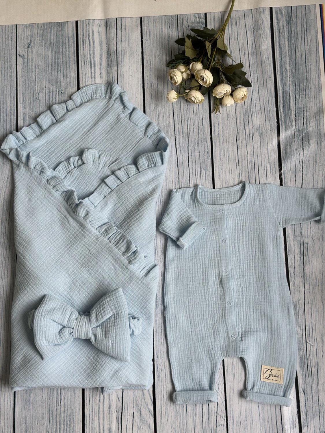 Теги: Купить детские конверты, комбинезон оптом, детские конверты на выписку оптом. 335-Г. Комплект из детского комбинезона, р 56 и конверта муслин, хлопок 100% 90/90 см, голубой цена,отзывы официальный сайт "Стеша Севастополь"