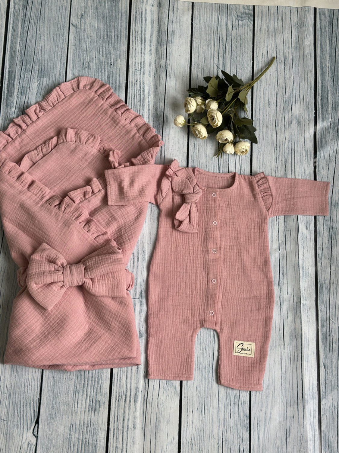 335-П. Комплект из детского комбинезона, р 56 и конверта муслин, хлопок 100% 90/90 см, пудра